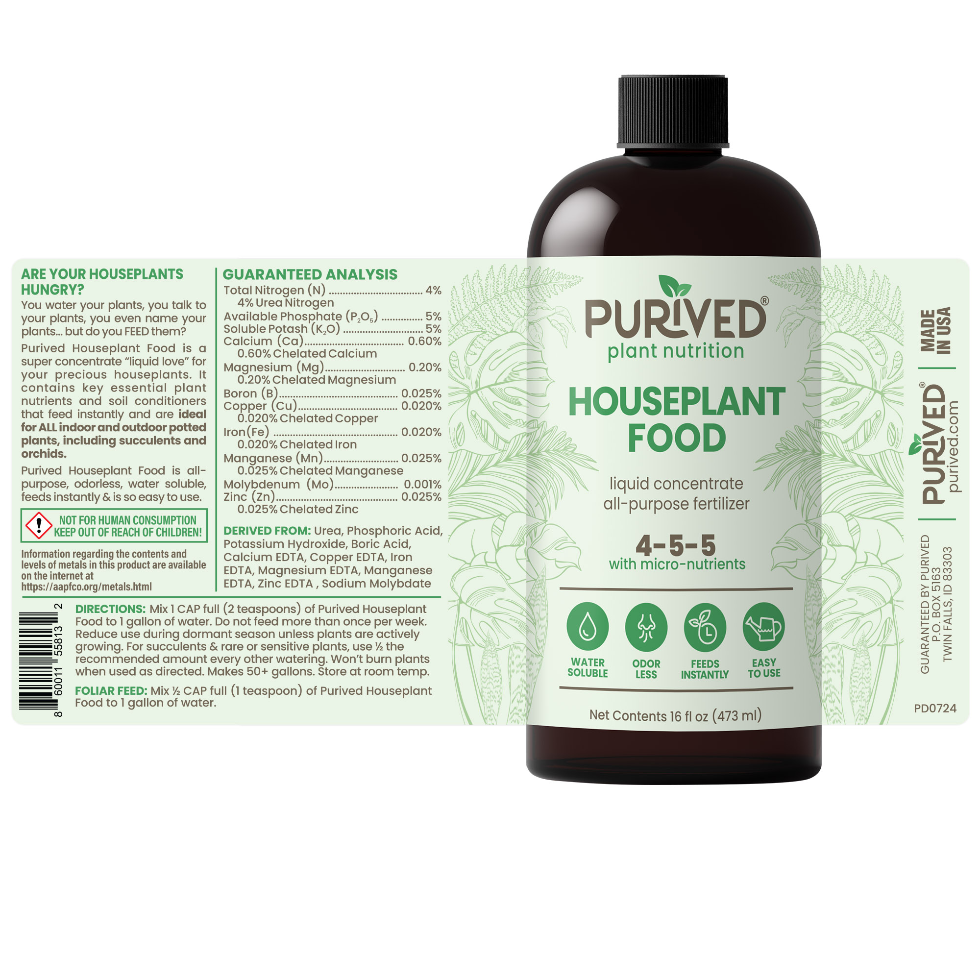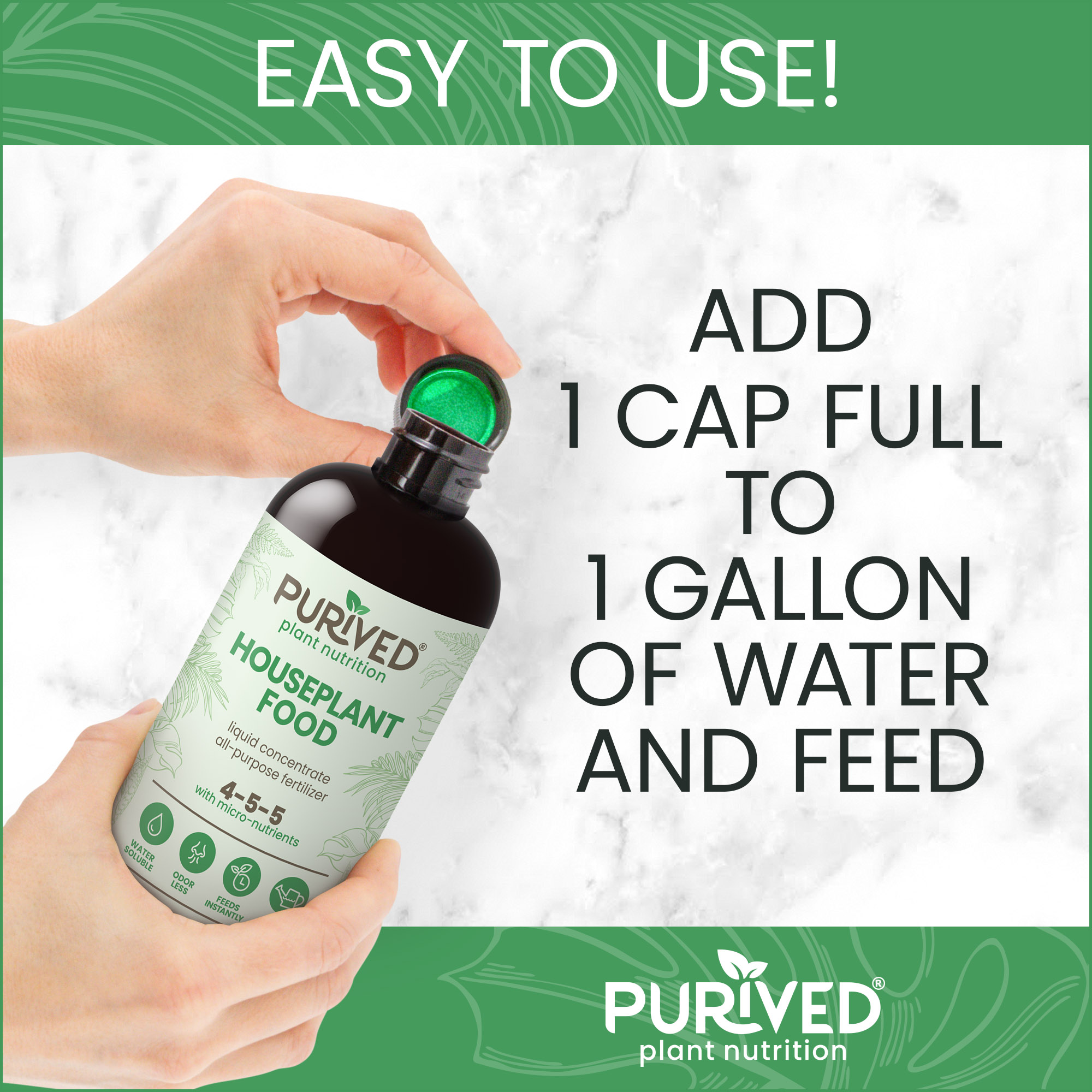 Purived Houseplant Food is water-soluble, so it feeds instantly - giving plants an immediate balanced supply of nutrients. Purived is a super concentrated all-purpose liquid plant food. One 16oz bottle makes 50 gallons of nutrient rich liquid houseplant fertilizer that's easy to use and it's odor free! Just Mix 1 cap full of Purived to 1 gallon of water. Feeds flowering plants, foliage type plants, succulents, edibles, cacti, and more.